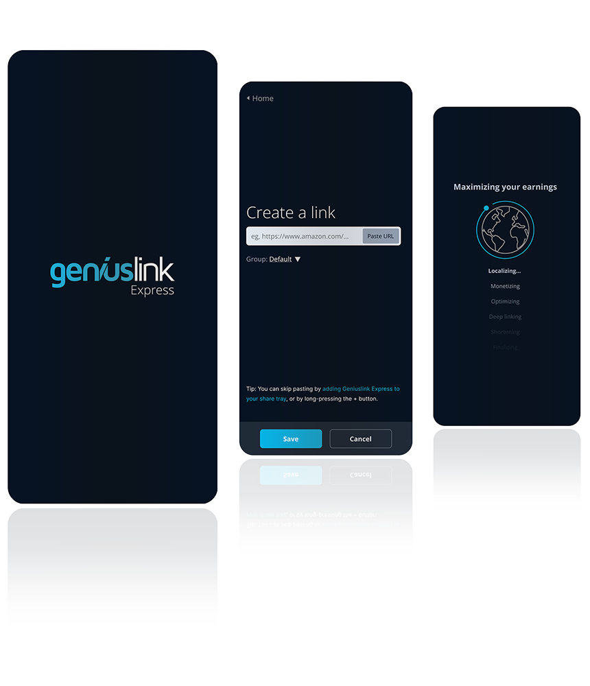 Create optimized affiliate links in seconds, anytime, anywhere. Geniuslink Express is your streamlined, on-the-go companion to the Geniuslink dashboard.